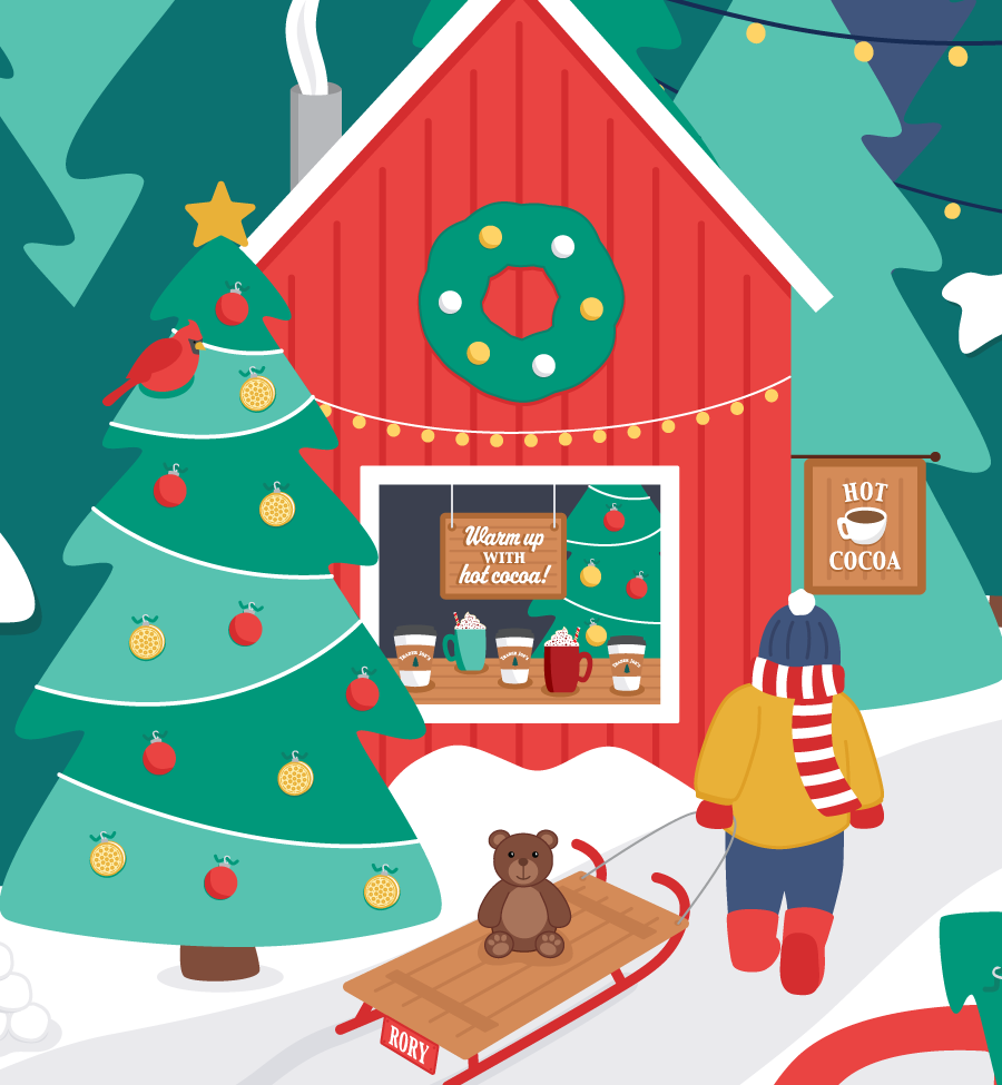 I designed this Advent calendar in my final week at Trader Joe’s. I was feeling inspired by my upcoming move to Vermont, and imagining my future life in a winter wonderland. I illustrated other Trader Joe’s products and incorporated them into the scene to provide “Easter eggs” and an extra element of fun and whimsy for the customers.